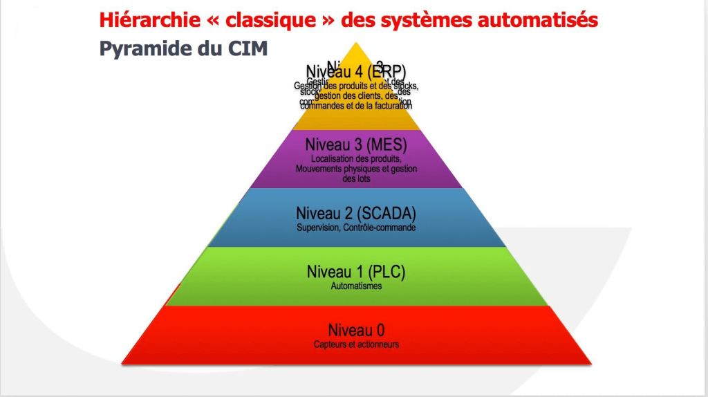 Pour essayer de mieux comprendre les positionnements respectifs du SCADA et du MES, revenons à la hiérarchie classique des systèmes automatisés, ce que l’on appelle souvent la « pyramide du CIM ».